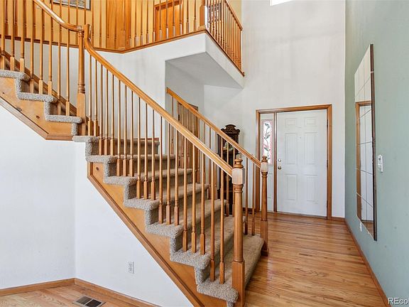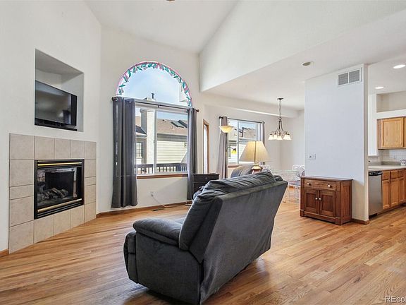 Coming into your next home, you will first be struck by the sharp and arresting entrance and stairway of this elegant yet comfortable townhome! Warm, natural woods are brought indoors with beautiful hardwood floors and banisters, a definite focal point of this lovely two bedroom, four bathroom home in the highly sought after neighborhood of Terrace at Columbine. Rooms are flooded with natural light through large windows and patio doors. The cozy living room invites relaxation with its vaulted ceiling and tiled gas fireplace, and the eating area is fresh and bright with patio doors to the upper deck, appreciate the view while enjoying your coffee or entertaining your friends. The large kitchen provides ample cupboard and counter space for storage and meal preparation. The Master Bedroom offers a large Master Bathroom with double sink, over-size cabinet, and good-sized walk-in closet with nice shelving and hanging space for your clothes. The second large bedroom has access to its own full bathroom. The laundry room with cabinets is on the main floor as is a half-bath/powder room. The walk-out basement provides more living space with a spacious family room with convenient and attractive built-ins, and this level has another half-bath with lots of storage and shelving areas. Set a showing today to see your sophisticated and tasteful next home in a desirable and choice location!