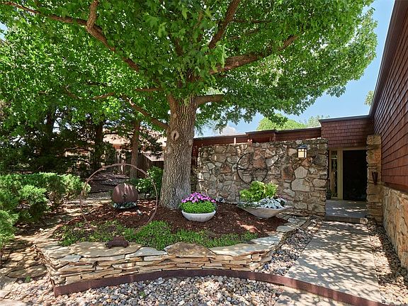 Step into a rare fusion of mid-century charm and modern elegance in this architectural masterpiece. With its stone-clad exterior and stained wood shake shingles, the home makes a bold statement from the very first glance. A welcoming courtyard sets the stage, leading you into a terrazzo-tiled entry and a light-filled atrium that brings nature inside with a living tree and lush plantings—an indoor sanctuary like no other. Floor-to-ceiling windows flood the interior with natural light and frame tranquil views throughout. The sunken living room invites both conversation and quiet evenings, centered around a dramatic stone fireplace and overlooking the peaceful courtyard. Ideal for both intimate gatherings and grand entertaining, the open living and dining areas flow effortlessly into a thoughtfully updated kitchen featuring stainless steel appliances, a breakfast bar, and a convenient built-in office nook. The primary suite is a serene retreat, complete with a mirrored wall of closets, remote-controlled blackout shades, and private courtyard views. Its en suite bath is a vision of luxury with dual stone vessel sinks, a sit-down vanity, and separate shower and toilet areas—all with a calming view of the landscaped courtyard. Two additional bedrooms share a stylish full bath, while a dedicated laundry area sits just off the kitchen leading to the garage. Outdoors, the rear courtyard is a showpiece of its own, with a raised flower bed perfect for artistic displays—be sure to inquire about which sculptures are available. This is more than a home; it’s a carefully curated experience of style, serenity, and sophistication.
