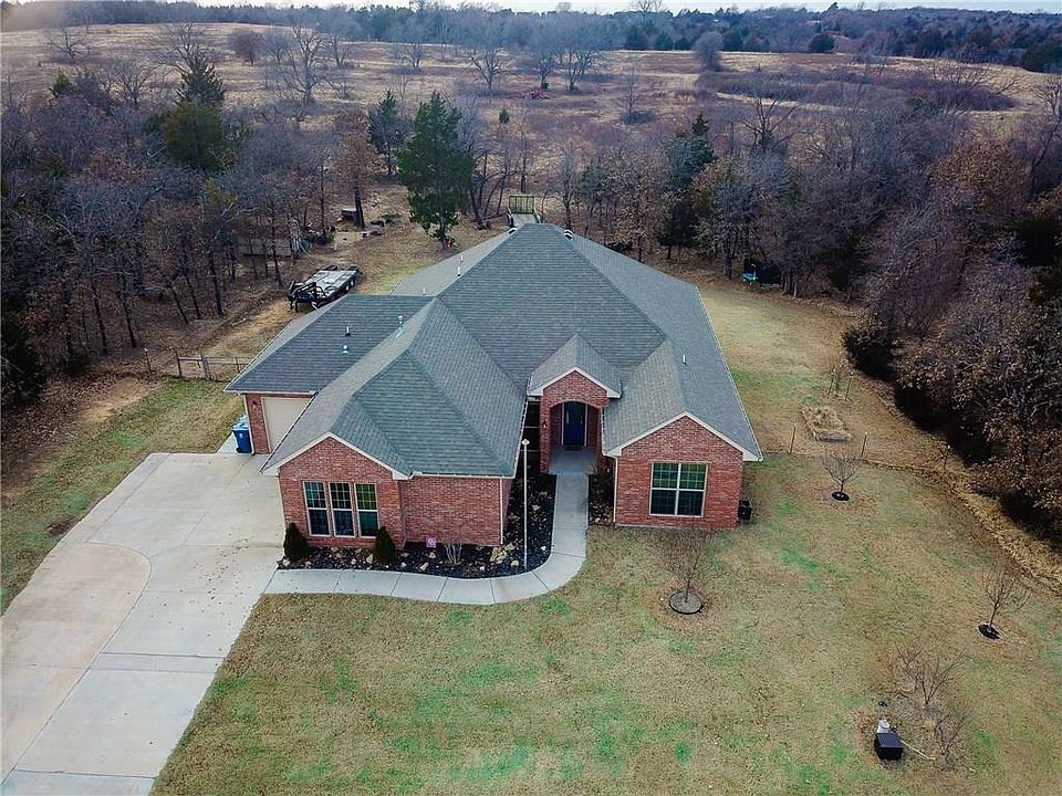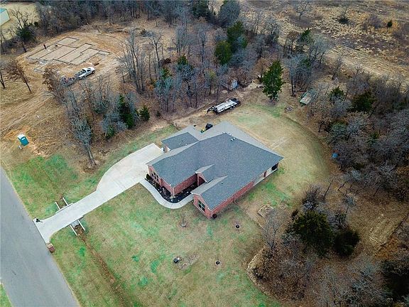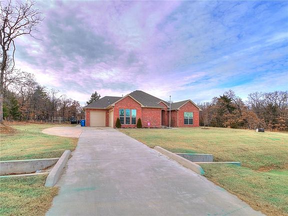 Beautiful home on wooded acreage lot. Country living w all the amenities, 22-minutes Tinker AFB, 22-minutes to downtown and 20-minutes to Edmond. 2 miles to Dollar General and 5 miles to Walmart! This home has everything you could want & more! Internet Service by TDS Telecom with HIGH SPEED Internet via FIBER directly to home. Wired w media distribution box allowing hard wired LAN connections throughout home for Smart TV's, computers, & gaming consoles. 14 sear AC, 95% furnace, R38 in attic, foundation insulated, gutters. Plenty of room for shop. 3rd single car garage separate from the 2-car. Open floor plan. 10 Foot ceilings. Huge Covered patio w room for outdoor kitchen. Upgraded Living Room Laminate Wood Flooring. Hot Tub 220 Plug & Hot Tub. Additional 220 outlet for RV hookup. Established fruit trees, Black walnut, cedar, oaks, elms & persimmons. In ground storm shelter in the garage. Established weed free yard sprayed twice a year. Buyer to verify.