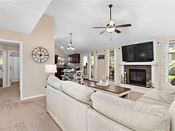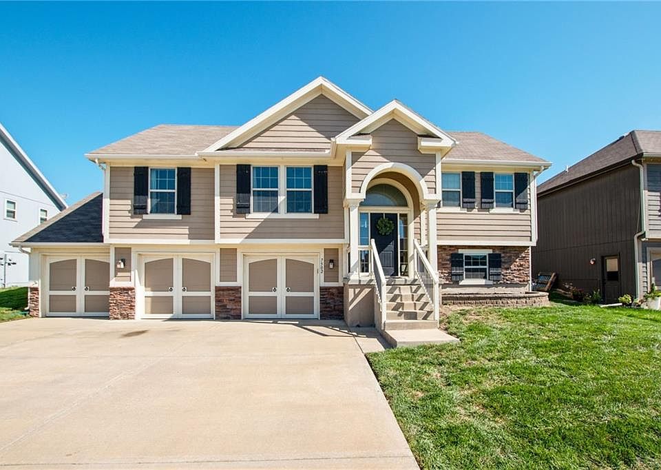 Charming, move-in ready, 3 bedroom, 2.1 bathroom split entry home in Brooke Ridge. The covered front porch opens into a tiled entryway. Walk up to a spacious living room that features newer carpet, vaulted ceilings, and a cozy fireplace. Hardwoods in kitchen and dining room with a NEW dishwasher and newer microwave! Walk right out the back door to enjoy grilling on a large, covered, newly stained/sealed deck. Fully fenced yard. Master suite includes vaulted ceilings, ceiling fan, jetted tub, walk-in closet, and double vanity. Laundry is conveniently located next to the 2 additional bedrooms. One secondary bedroom features a custom accent wall. Walk downstairs to a fully finished basement with daylight windows and a half bathroom, perfect for game-day celebrations! Tiled floors with a drop zone lead to a HUGE, freshly painted 3-car garage. Extra storage space in the attic above the 3rd stall is perfect for Christmas decorations or hunting gear. Walking distance to award winning Kellybrook Elementary in the Liberty Public School District. This one is a MUST see!