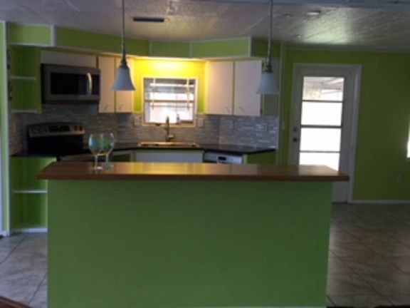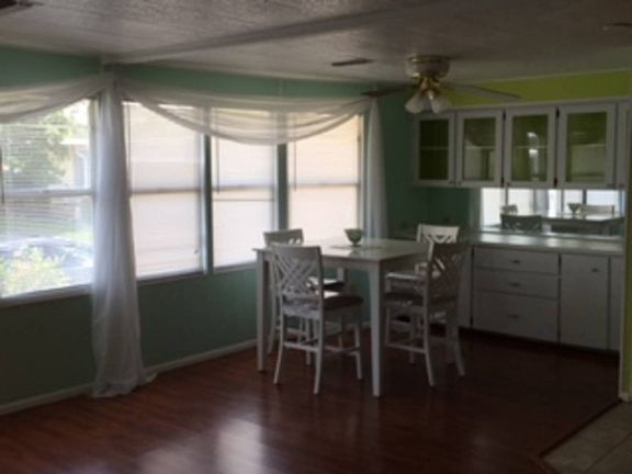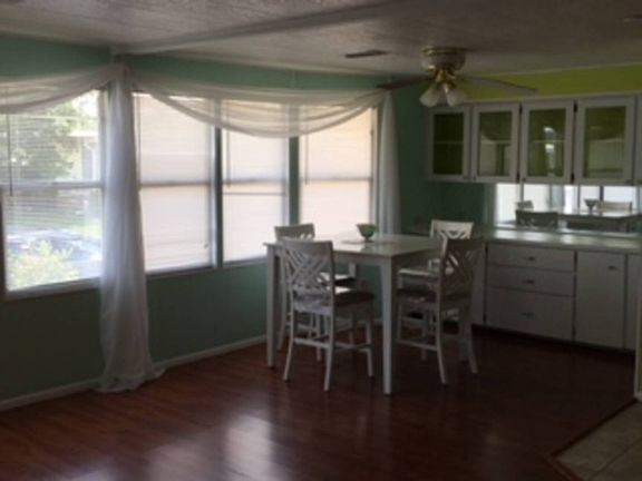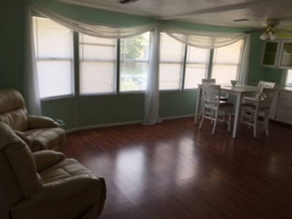 3 MONTHS LOT RENT PAID with full price offer! Motivated Seller! Open Concept and updated home with 2/3 bedrooms and 2 baths. This home has a convertible garage/lanai, so chose who you would use this large space. Guest bath fully renovated including new shower and vessel style sink. Great, large kitchen with stainless appliances, including a double oven, a convertible farm sink and a Bosch dish washer. Large corner lot. Floors refinished with beautiful wood laminate just 4 years ago. Deck on front of home (10 x 10) with a ramp for convenient entry. Metal detachable hurricane shutters included in sale! The home is a Fleetwood, 1979, 1420 square feet. Must see! Lot rent is only $868.13 /monthly.