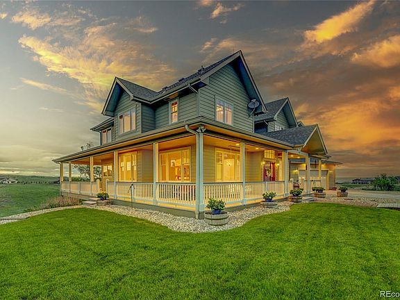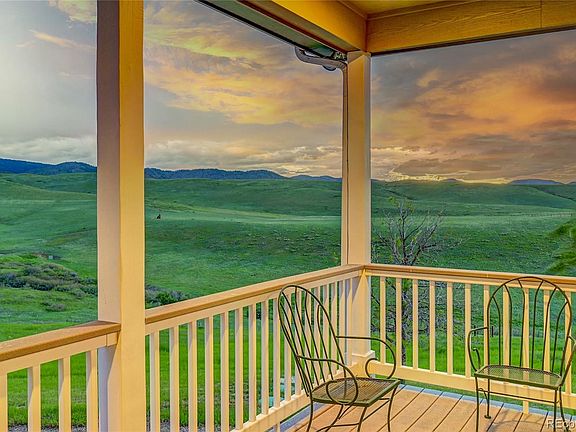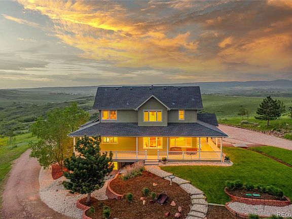 Gorgeous views and the tranquility of country life welcome you as you drive through the custom gate of this beautiful property. Here you'll find a timeless two-story home with wrap-around porch, 39+ acres of rolling hills and panoramic scenes that stretch from Roxborough State Park to the skyline of downtown Denver. There's space to homestead, have your horses or livestock, all within minutes of the quaint town of Sedalia, the City of Castle Rock, and easy access to I-25. The home's 4 bedrooms and 6 baths provides plenty of room for family and guests, and its purposeful design creates a picturesque view from every window. The main floor features beautiful hardwood floors and vaulted ceilings. The kitchen with its plantation shutters takes advantage of the sprawling landscape. A center island will quickly become a favorite gathering place. Beautiful cabinetry, Corian counters, a walk-in pantry are all in the details. Casual dining is just off the kitchen with a door to the deck and wrap-around porch. The great room has vaulted ceilings, large windows and a delightful gas stove. The main floor laundry room with 1/2 bath is conveniently located near the garage entrance with an additional 1/2 bath down the hallway. Upstairs you’ll find the primary suite with incredible views, 2 large walk-in closets and 2 individual bathrooms. There are 2 secondary bedrooms and a 3rd full bath. The upstairs bonus room features high ceilings, large windows, and brings opportunity for creative use. The finished walk-out basement is flooded with natural light and is a spacious gathering area, complete with pellet stove, pool table and wet bar. There is a 4th bedroom with an over-sized walk-in closet, a full bathroom, 2 hobby rooms both with counter and cabinets, and a large finished storage room. The attached oversized garage has 3 bays, with one designed to be used as a shop. The barn has a single car garage space, two stalls and corral area. Horseshoe pit, garden and shed!