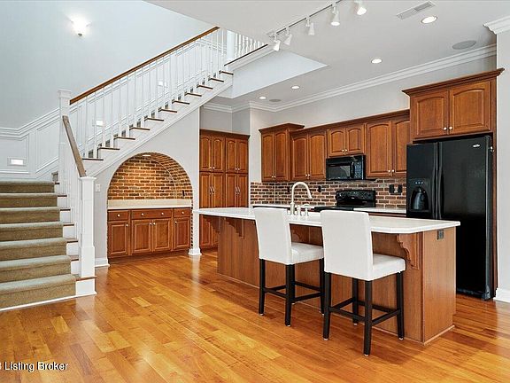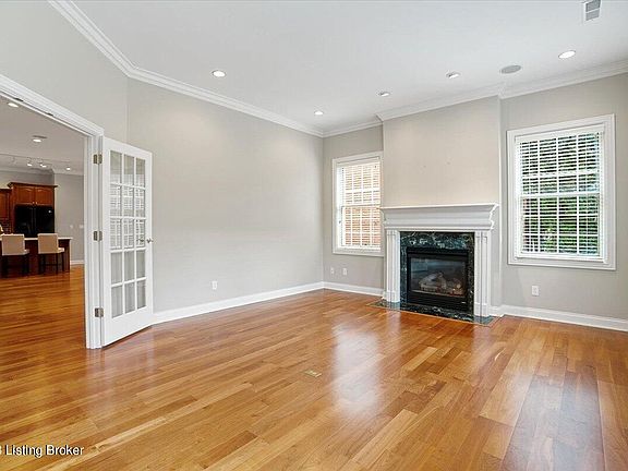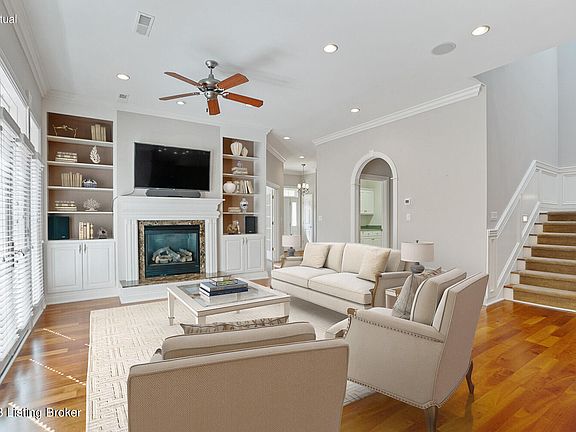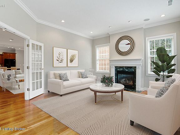 Few condos in our area capture the luxurious feel and craftsmanship that the Smithfield Greene condos offer. This particular unit is one of the gems of the neighborhood with its maintenance-free first floor living and high-end finishes that you would expect from a home in Prospect. Make no mistake as this is where privacy, tranquility, majesty, and phenomenal location all come together. Whether you enter the home through the beautiful common courtyard in the front, or the intimate cul-de-sac in the rear, you are met with a feeling that this neighborhood strives for a well-manicured cleanliness. Through the main entry you are met with impressive 10' ceilings that run throughout the main floor. Transom windows, a chandelier, and a hardwood look floor all lead you towards the first of two living rooms. This front room is a more formal den, separated from the open-concept area beyond by double glass French doors and centers around its beautiful fireplace surrounded with a regal mantle. The central hosting area consists of the larger living room with its own fireplace and built-ins, the extensive ceiling speaker system (all equipment remains), and the kitchen with an expansive solid-surface counter that is both classy and utilitarian. The arched doorways and extensive trim, wainscoting, and crown molding make this home fit for royalty. There is no lack for kitchen storage as custom cabinetry abounds and there is a fabulous arched coffee/wine/bourbon nook off to one side. The hosting space does not end here as there is a very fancy formal dining room with beautiful trim work and an abundance of natural light pouring in from the private, gated brick courtyard. There is also a half bath and a spacious laundry room with sink, cabinets, and folding surface just on the other side of the living room. At the rear of the main floor you will find the large primary bedroom with its brand new carpet, double walk-in closets, and double vanity primary bathroom.