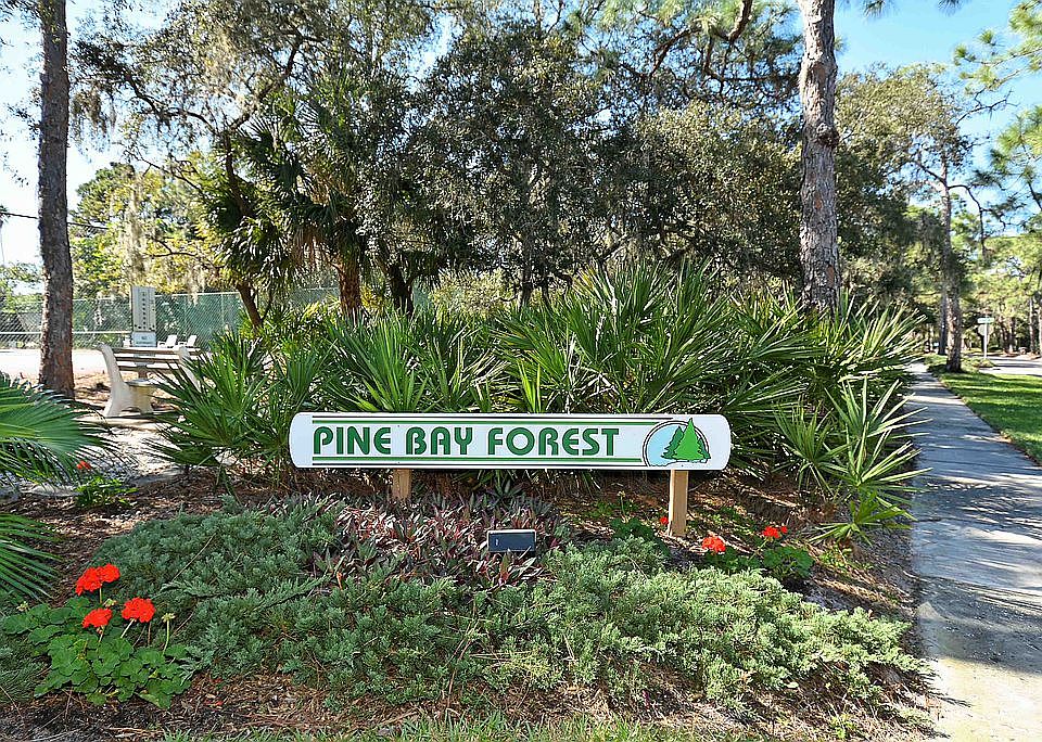 If you're looking for a home only 5 miles from the public beach at Beautiful Anna Naria Island Fl. for less than $500,000 this just may be the place for you. Pine Bay Forest located on the shores of Palma Sola Bay is Northwest Bradenton's premier condo complex. Offering Lush landscaping, heated pool & spa, saunas, shuffleboard, tennis, pickleball, and an observation deck overlooking the bay for watching the spectacular west coast sunsets over the Bay. Walk, drive, bus or bike only 5 miles to the world class beaches of Anna Maria Island for sun & fun. Two miles to Robinson Preserve, a Trip advisor top 10% in the world, for kayaking, fishing, and nature trails. Super convenient to Publix, banking, restaurants, nightlife and a brand new Target to be opening soon. As you enter this home and are wowed by soaring cedar plank ceilings and Celestry windows in the great room. Ceramic tile flooring and views into the lushly landscaped back yard give this home an airy & open yet cool & serene vibe. Both bedrooms feature en suite bathrooms and walk in closets, The huge Master bedroom has two walk in closets, vaulted ceiling and sliders to a private storage/patio. The kitchen features tile backsplash, white cabinetry and appliances. Laundry with full sized washer and dryer are conveniently located next to the kitchen. Living room has cedar planked, vaulted ceiling with sliders to lanai looking out to green area. Location and access to amenities make Pine Bay Forest the most desirable condos in northwest Bradenton. (Roof 2022, AC 2018)
