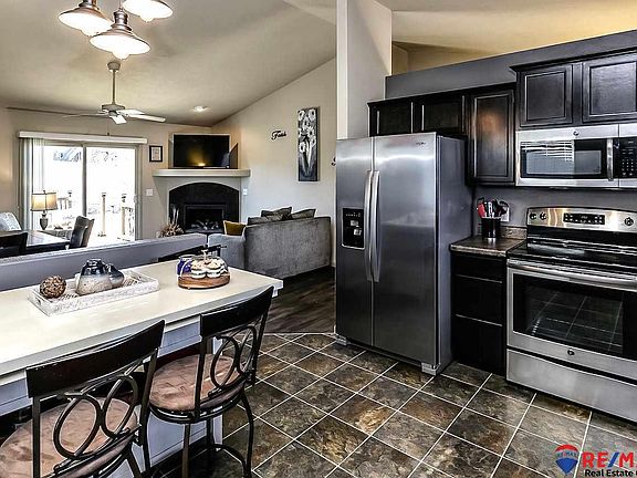 - Living Room Desc: Fireplace, Cath./Vaulted Ceiling, Ceiling Fans, Window Covering, Laminate Flooring, 9'+ Ceiling, Sliding Glass Door