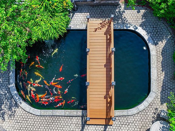 This charming home features the master suite on 1st floor w/trey ceiling, jacuzzi tub, separate shower, huge walk in closet, dule vanity. Kitchen w island, NEW Stainless steel appliances, ceramic surround. Hardwoods throughout downstairs including master. 2 bedrooms upstairs with jack and jill bath and huge bonus room over 2 car garage. Back yard features custom built Koi fish pond w/waterfall and attractive bridge and greenery all around. Elaborate stone work in completely fenced back yard is a work of art, must see to believe.