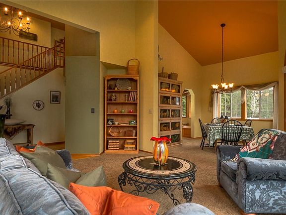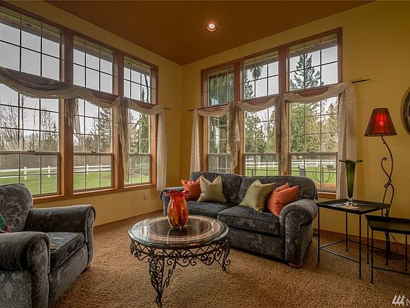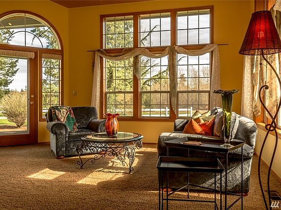 Arlington Hilltop Estate on 5.45ac. Circular driveway, fenced yard, shop. 3BR + Den, 2.75BA,formal LR, DR, FR, and breakfast nook with built in seating and storage. Heat pump with AC, 3 car garage w/one over sized RV door. Hardwoods, tile, custom fixtures. Recently updated interior surfaces in kitchen/baths/showers. Newer roof/carpets/appliances. Artistic landscaping vignettes a Master Gardner would appreciate. Property extends beyond the fence lines. Centennial Trail just down the street!
