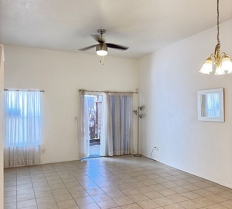Charming three-bedroom, two-full bathroom townhome. A great property centrally located in Albuquerque. Easy access to public transportation, schools, UNM, shopping, malls, I-40. The property features three bedrooms with plenty of natural light and ceilings fans in all rooms. The fenced front yard has a beautiful tall pine tree for shade, and xeroscape landscape. Master bedroom is on the lower floor with an adjoining full bathroom with a tub and brand new shower fixtures. Remaining two sunny bedrooms with plenty of closet space, and full bathroom with a tub/new shower fixtures are located on the second floor. Separate laundry room with plenty of storage space, with washer and dryer also in second floor. All bedrooms and stairs are carpeted, recently cleaned and well maintained. Brand new AC system. Living room/kitchen areas share an open space with high ceilings. Enjoy the private backyard which is accessible through the living room. Backyard is half covered and has concrete floor, other half remains open for gardening ideas and plenty of room for enjoying a good barbeque. This property is in very good condition. Parking space is available for three cars. Two on driveway and one in spacious garage. Monthly rent: $1,600 + utilities. Deposit: $1,600. Pets accepted (extra fee applies) Renter responsible for water, electric and gas. Pets allowed is negotiable. One-year lease.