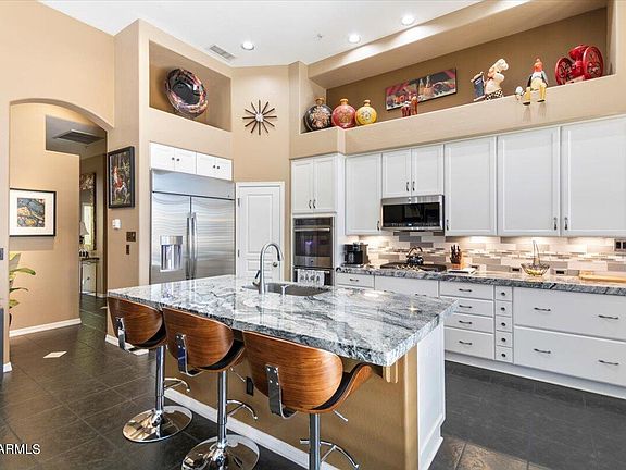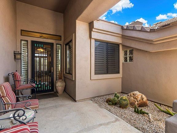 Magnificent in Monterra. Gated front courtyard and compelling entry. Large living room and dining room with a view of the pool and backyard. Plantation shutters with shades. Huge split primary suite with jetted tub, double sinks and a bidet. Excellent flooring throughout. Impressive kitchen with to die for island. Rare light granite that pulls it all together. Five burner gas cooktop. Southern exposure breakfast room and a color coordinated family room that says Ahh. The work at home professional will love the home office with beautiful built-in cabinetry offering plenty of storage. Outdoor living at its finest. Resort style yard with luscious landscape and newly tiled pool and spa. Two extendable awnings double the patio space. Great three car garage with enough cabinets to satisfy the hoarder in anybody. Beautiful 1/2 acre setting surrounded by natural area open spaces. Easy access to Mayo Clinic and Thompson Peak HonorHealth.