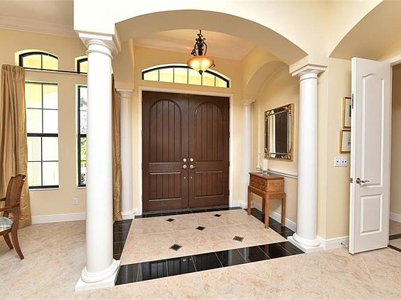 This custom home with stunning lake and golf course views is located on over a half acre home site in the gated community of Country Club East. The entry boasts double doors that open to the formal living and dining room with neutral tile floors, decorative columns & extensive moldings. The functional kitchen boasts quality wood cabinetry, 6 burner gas stove with vented hood, granite counters and beautiful tiled backsplash. The breakfast bar leads to the casual dining area and family room complete with surround sound, tray ceiling and custom built-in cabinetry. The disappearing sliding doors open to a spectacular paver lanai with salt water pool & spa, two covered living areas, gas fireplace and fully equipped outdoor kitchen. There is also a lushly landscaped expansive yard with the option to add a fence. The luxurious owner's retreat features gorgeous coffered ceiling treatment, sitting area with bay windows, private door to the lanai and two walk-in closets. The spa-like bath offers separate vanities, Jacuzzi tub and walk-in shower. There are 2 additional bedrooms downstairs, each with their own bath as well as an office/den in the back of the home overlooking the lake and golf course. The upstairs has an additional guest bedroom and bath as well as a bonus room and sliders opening to the balcony with more breathtaking views. Richly detailed with upgrades galore, this home is not to be missed!