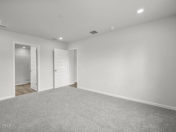 In the kitchen and bathrooms, you will see the beautiful granite countertops and white cabinetry that has brushed nickel hardware. The primary bathroom has a large closet with ventilated shelving and a dual sink vanity. The kitchen has stainless-steel appliances including a stove, microwave, and dishwasher with center island is open to the large living room and dining area. Three additional rooms are located off the front entry hall as well as a laundry room.