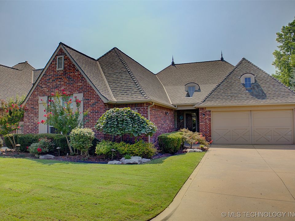 Newer price!! Beautifully constructed custom single-story home featuring a screened porch with a tranquil view of the pond. Updated with cozy warm colors the split bedroom floor plan, Study or formal dining room, pantry and lots of storage in the kitchen Counter depth kitchen refrigerator stays, great extras like a pet door into the utility room, wired for a hot tub in the very loved gardens and automated sprinkler system! Even the abundant attic storage is reachable by a flight of stairs. Best of all, the home is handicap accessable with wide hallways, doors, elevated dishwasher and floor level showers. Gated with zero lot line in Jenks Schools near every service to make life lovely!