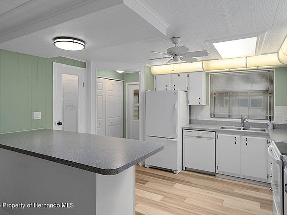 Affordable Florida living for your next season in life! Now's the time! Brookridge is 55+ Community where you own your own land with low HOA fees. The community is gated 24/7 so if you travel or want to live a snowbird life you will have peace of mind. This 2 Bedroom 2 Bathroom is a very spacious 1,430 sq ft with a nice kitchen that boasts lots of Counters, Cabinets, and a Pantry! Large Open Living room with windows galore for natural lighting! The kitchen even has a skylight. Newer Flooring, interior paint and vapor barrier. Formal dining area for entertaining or hosting. Large screened porch provides additional room and shade for gathering and enjoying the best of Florida living. With a carport and a small, separate garage for your golf cart. The primary bedroom has a spacious en suite, two closets, dual sinks, makeup vanity and tub/ shower combo with separate toilet closet. Large ⅓ acre yard. Carpet in bedrooms only. AC 2016. Windows replaced 2018. Metal Roof and screws sealed 2025. 3 steps to exterior doors. Water heater is older but is satisfactory. Seller will consider replacing water heater with accepted offer. The laundry room is located in the utility room just off the screened porch. Washer and Dryer, refrigerator, range, dishwasher and microwave convey. The Brookridge Community is Gated 24/7 and is brimming with activity boasting a 72-par Championship Golf Course & Pro Shop, Heated Swimming Pool, Tennis/Pickleball and Shuffleboard Courts, Horseshoes, Bocci Ball Court, Club House, Bingo, Crafts, Shows, and over 100 social Groups. On-site RV and boat storage. There is a real sense of community where you will meet new friends. Just minutes away from the Suncoast Parkway, which provides a quick and direct route to Tampa, St. Pete, Sporting Venues, Cultural Arts, and world-famous Beaches as well as the Tampa International Airport. Hwy 50 is a direct route to Orlando. Enjoy nearby shopping, dining, and entertainment options. Don't miss this rare opportunity to own a piece of Florida paradise in Brookridge. Schedule your private showing today.