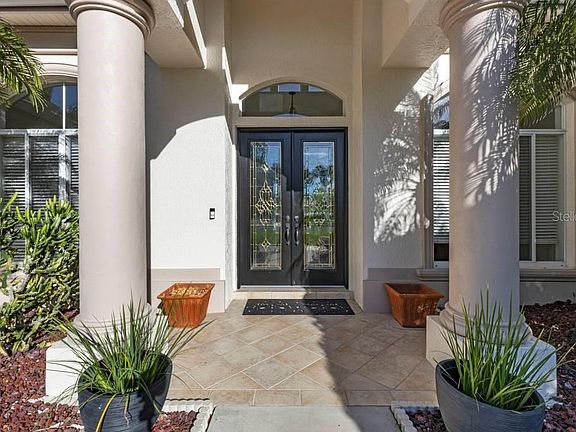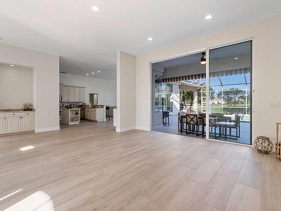 Former Pruett Model in River Club, this beautifully updated home has new porcelain wood plank flooring throughout, giving it an open modern feel. Many designer touches throughout including tray ceilings, crown molding, and high end finishes. This open floor plan includes a formal living room and dining room with butler's pantry, an office with built ins, and a split bedroom plan. Master retreat is oversized with a sitting area, double tray ceiling, two walk in closets, and a large bathroom with dual vanities and garden tub. Two guest bedrooms across the house share a bathroom. An additional large fourth bedroom is off the back of the home with it's own bathroom, making it perfect for guests. Kitchen features granite countertops, stainless appliances, a breakfast bar, pantry, desk, and dinette. The beautiful lanai has a covered area for dining or entertaining, along with a heated pool and spa. This gorgeous property overlooks the 15th hole, for the golf enthusiast, or for enjoying the beautiful scenery. River Club is a hidden gem, with low HOA fees, and no CDD's! Close to Main St in Lakewood Ranch, I-75, A-rated schools, and a short drive to downtown Sarasota and beaches, this is an ideal location! Set up an appointment to view today!