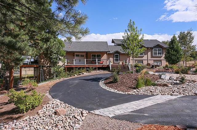 What a find! Close in acreage in the Cherry Creek School District that is a true horse property! Located at the top of a cul-de-sac with a large modern two stall barn and adjacent to the bridle path. Step inside to beautiful hardwood floors that extend from the entry into the formal dining room, kitchen and main floor study that shares a two sided stone fireplace with the vaulted great room. Lovingly updated kitchen boasts white cabinets, slab granite countertops and a farmhouse sink. Stainless appliances include double Jenn Air ovens, a gas cooktop, dishwasher and refrigerator plus the mini wine fridge stays. Upstairs baths have been remodeled, five piece master has an oversized shower, stand alone tub and granite countertops. Hall bath was reconfigured to accommodate separate sink areas, both with granite tops. Partially finished walk-out basement has 4th bedroom, 3/4 bath and family room. Relax on your front porch or covered no maintenance deck and enjoy the tranquil views.