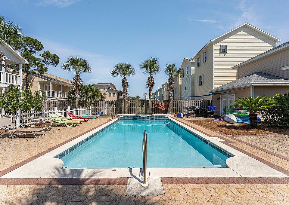 Beautiful costal beach home just a 3min walk to the Gorgeous White Sands and Emerald Blue Waters of Panama City Beach! This home has a Gulf view from the second floor master bedroom balcony! This newly professionally decorated and fully furnished 4BR/3BA home would make a great turn-key investment property or keep for yourself & enjoy endless beach vacations. Recent upgrades include a new roof in 2019, newer carpet, stainless steel appliances were added to the kitchen, & new furnisings through-out. The 2 bedrooms on the first floor each have French doors that open to the patio & the semi-private pool that you only share with 4 other homes. Upstairs you'll find a third bedroom with private bath, & the master suite with en suite boasting a double sink vanity, walk-in closet, garden tub, & a separate shower. Short-Term rental friendly with great projections! No agents please. Buyer agents welcome.