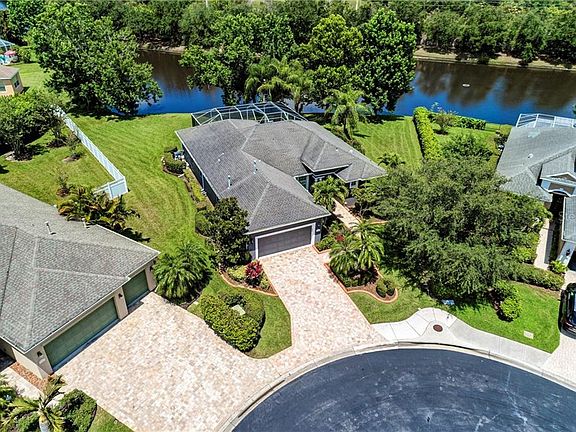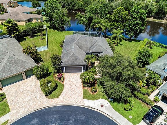 Gorgeous lake views with complete privacy, this home's cul de sac location offers sweeping views of the lakes and fountains. The beveled glass entry door welcomes you with foyer entry and formal living and dining room. The gourmet kitchen features a natural gas range with quartz counters and back splash, under counter lighting, reverse osmosis drinking water and upgraded pendant lighting over the breakfast bar. The split floor plan allows privacy for the master suite with upgraded electronic blinds. 2 guest rooms share a bath, both fit queen sized beds comfortably. The 4th bedroom and bath have the convenience of a pool bath, with easy access to the lanai and pool deck. Multiple sets of sliding glass doors open to the pool deck which lend to wonderful views of the pool and lake beyond. Enjoy outdoor living on the extended screened lanai, upgraded with a beautiful designed paver decking that matches the driveway. Add your own outdoor kitchen easily, its already plumbed with natural gas and water in the covered section of the lanai. University Place is a gated community featuring 2 heated community swimming pools, one for laps and a spa/jacuzzi and the other pool has water park features perfect for kids or grandchildren. Both community pools have outdoor grills and kitchens perfect for entertaining and meeting the neighbors. Great neighbors are an added bonus.