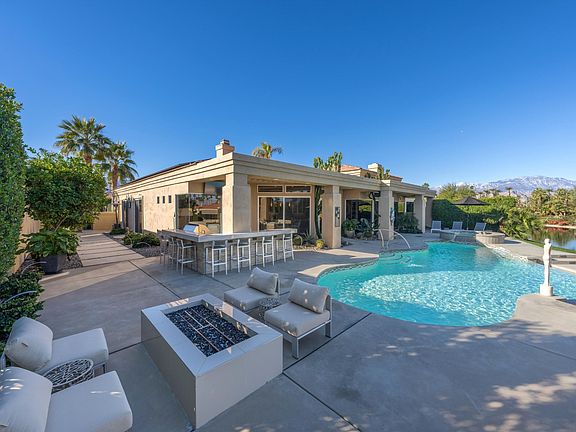 Highly customized Riviera Plan-3380 Sq. Ft. (4 BR/4.5 BA including Casita) at Desert Horizons CC ideally located within the city of Indian Wells. Situated on an elevated lot with stunning water and mountain views. This home is being offered with Designer furnishings, art and accessories throughout. Extensively remodeled in 2020 (including new wiring, garage A/C and salt water pool conversion). The very desirable split floor plan features a master suite on one side of the house and two (2) additional bedrooms (each with it's own bathroom) on the opposite side PLUS a detached Casita in the front courtyard. Plenty of privacy for all! Call to make an appt. to view this fabulous property and I will give you a personal 5 minute presentation before you start your tour! This property has been impeccably maintained showing true pride of ownership. The kitchen and family room both overlook the Outdoor Kitchen, with Built-in Barbeque, refrigerator, Bar area with seating for eight (8), Pool/Spa, and Fire-Pit which creates an exceptional outdoor living environment. Seven (7) Televisions come with the house! Solid core interior doors throughout. A double door entry welcomes you to the master bedroom suite. To the left is a lavish bathroom with custom double shower, dual sinks and vanity. To the right is the beautifully furnished bedroom has plantation shutters, ultimate privacy and stunning views. Ultra efficient 36 Panel Solar System, 19-Seer HVAC with three (3) separate thermostats (or Controlled by Lennox App) for highly efficient cooling and heating.