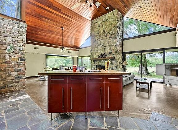 Amazing art house said to have been designed by Frank Lloyd Wright with wide open spaces and vistas from every side; vaulted wood panel ceilings, soaring stone fireplace; ultra modern kitchen w/slate floors; also for sale as a whole property in the MLS with a large house, barn & 2 guest houses; too many details to list, please call agent for more info & schedule a showing! See attachments for more description.