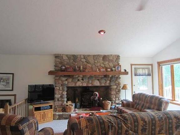 Beautiful Cedar sided home featuring 201' of level western facing, sandy frontage on Fisher Lake, a 3- lake chain! Inside you'll find an open concept kitchen, living, dining area set under a cathedral ceiling and overlooks the stunning lake views. There is a large stone fireplace surround with wood burning stove, oak kitchen cabinets and great center island/breakfast bar! The full bathroom features a whirlpool tub and shower, while the spacious master bedroom offers a huge walk in closet. The walk out finished lower level has a dynamite rec room, complete with a brick fireplace surround with wood stove, fantastic wet bar, second bedroom, bath and laundry room. A new 3 season porch sprawls across the home overlooking the water, while a large deck offers the same dynamite view from on top off the main level. There is an attached 2 car garage, insulated, finished and heated with a Hot Dawg heater, plus a detached 24'x28' garage for all your toys.