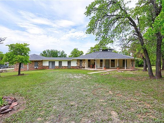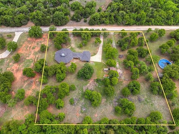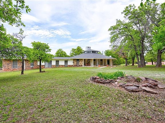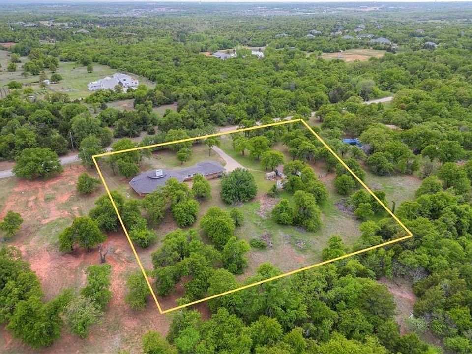 Step into this truly unique 3 bed, 2 bath home in East Edmond. This private wooded 2.5 acres is a rare find being just minutes from I-35 & all the conveniences that Edmond has to offer. Grand entry captivates your attention as you are immediately pulled to the iconic hearth in the middle of the octagonal conversation-style living room. Incredibly high ceilings & windows let the natural light pour in. The kitchen offers tons of storage, beautiful tile countertops, & stainless steel appliances. The primary bedroom features a spacious walk-in closet, private access to the back patio, & a private ensuite. The primary bathroom features a walk-in shower & spacious vanity. Guest bedrooms 1 & 2 both offer large closet spaces & bright windows. They share the full guest bathroom with a shower/tub combo. Spacious second living area located off the kitchen w/ tons of windows & dry bar. Outbuilding with electricity. Relax in the peace and quiet while admiring the trees on the open back patio!