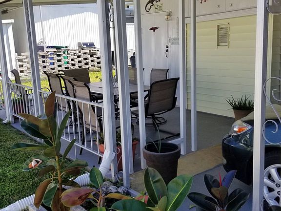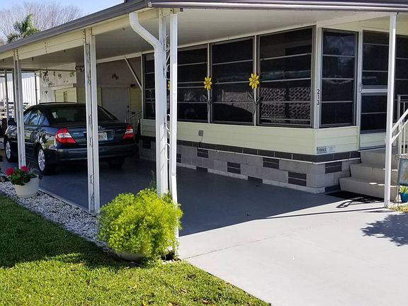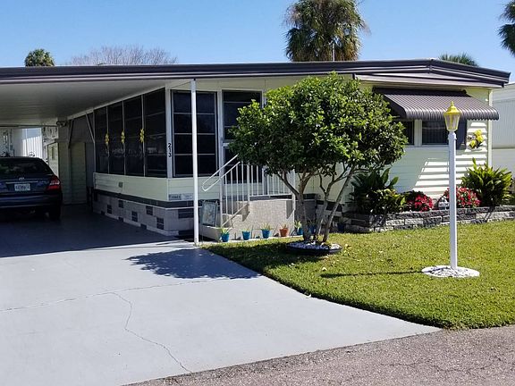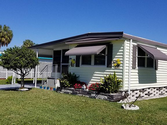 This is a mobile home in a 55+ community on a rented/leased lot. Check out this 1BR/1BA mobile home with updates galore, move in ready and in pristine condition. The home comes mostly furnished/turnkey! There are newer windows throughout, newer cabinets and countertops, a remodeled bathroom, a finished lanai, a covered patio and vinyl siding. The front set lanai is 10 x 20 with vinyl tile flooring and vinyl/screen windows; perfect for watching the world go by. The eat in kitchen has vinyl tile flooring and has been updated with wood cabinets. There is ample storage, a food pantry, refrigerator, stove, dishwasher and microwave. The adjacent living room has vinyl floors, custom paint and vertical blinds. The bedroom has vinyl tile floors, custom paint and vertical blinds. The hall bath has tile flooring, upgraded single sink vanity and a walk in shower. The carport will park two cars, tandem style. There are two sheds. One shed houses the washer/dryer (included in the sale). The lot rent is $652 and includes the community amenities below. Palm Bay is a 55+ community with a club house and pool.... Palm Bay is close to shopping and outdoor dining on the Manatee River. It is only minutes away from the great Gulf beaches.. Florida MH Sales, LLC cannot guarantee or warrant the accuracy of this information, measurements or condition of any property. Measurements are approximate. Lot rent is subject to change.