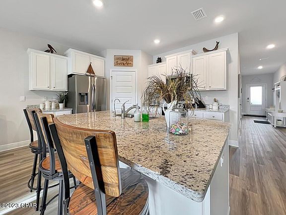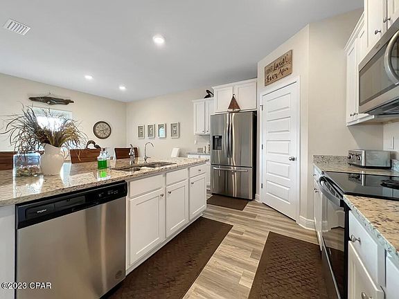 DESIRABLE 4BD/2BA NEWLY CONSTRUCTED WATERFRONT HOME IN THE COVETED COMMUNITY OF WINDMARK BEACH! Welcome home to one level living at its finest offering a comfortable & spacious open concept design. Positioned on a premium waterfront lot, this beautifully crafted home provides a range of sought after features. Luxury vinyl plank flooring & 9' ceilings extend the entire space creating an open & airy atmosphere. Trey ceilings in the living area & primary suite along with 5'' base molding adds an extra touch of modern elegance. Durable granite counters & designer lighting are included in the kitchen & bathrooms in addition to custom cabinetry, breakfast bar seating, walk-in pantry & stainless steel appliances. Conveniently located off the dining area is a covered patio overlooking the water perfect for grilling and cocktails at sunset. Wake to a water view in the primary suite complete with a walk-in closet, garden tub, separate shower & double vanity. Three additional bedrooms & a nicely appointed full bath finish the layout. Smart Home Technology is available to enjoy the benefit of the latest IQ Panel, HD touchscreen & Smart Thermostat. The exterior includes an outdoor shower with privacy enclosure, maintenance free four-sided Hardie siding & front entry garage for covered parking & added storage. Take care of your new landscape with ease with a newly installed well & pump adding value and saving on utilities. As an added bonus, all new white Bahama storm shutters were recently installed. A golf cart community all its own, Windmark Beach amenities include a community pool, day docking, bike trail & walking paths. Visit the town center for waterfront dining, mercantile shops & fitness center. Boardwalk beach access leads to white sand pet friendly beaches for shoreline fishing, kayaking & more are all just a short walk away! In an area with proven rental income, this would make an ideal investment or full time residence. Call today for a showing!