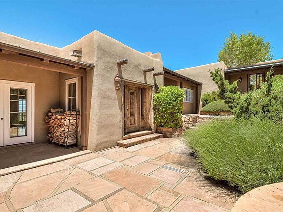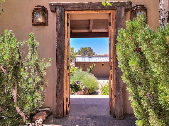 Just off Hyde Park Rd, minutes from Santa Fe Plaza, with spectacular mountain and city views, this 3 bedroom 3.5 bath Doug McDowell adobe home is located in the gated community of Vista Canada Ancha. Polished finishes such as high beamed ceilings, flagstone floors, and cherry wood cabinets and floors. Spacious living room with a stylish fireplace and double patio doors. Formal dining room has access to the back portal for dining al fresco and entertaining. Chef's kitchen is appointed with high end appliances, glass front upper cabinets, farm-style sink, and breakfast area. There are two master suites, the largest of which has a study. Split bedroom plan for the third bedroom which offers flexible space as a studio or office. Lots of built-in bookcases and shelving throughout. Welcoming entry courtyard, multiple covered patios/decks, water feature and an oversized 2-car garage.