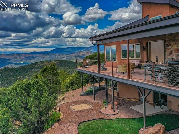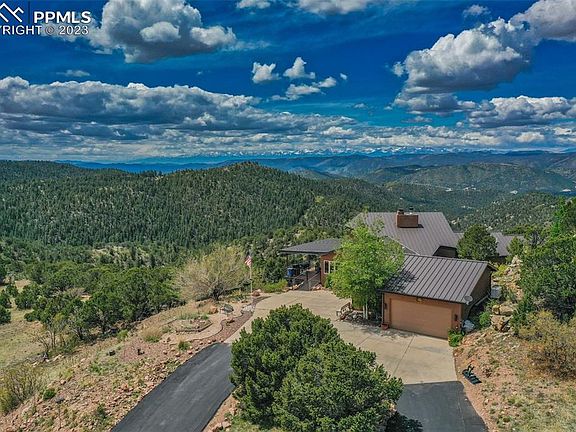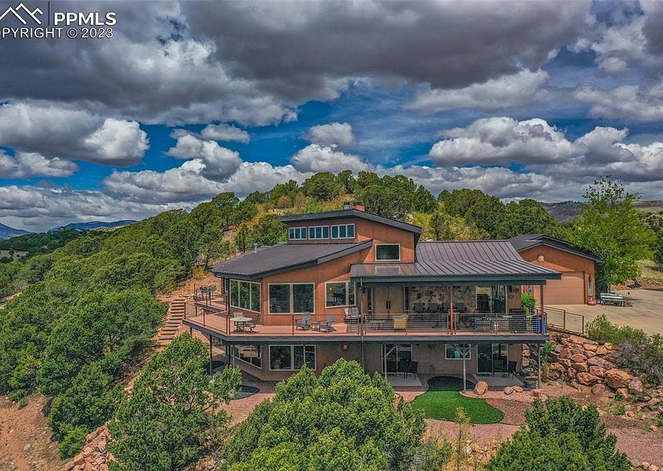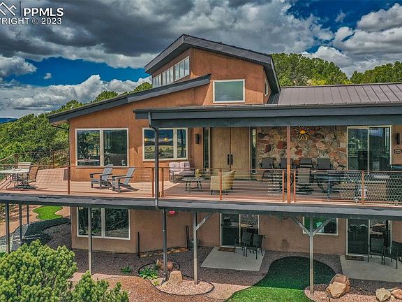 Experience the wonders of Colorado with full panoramic views of Pikes Peak, Collegiate Peaks, and Sangre de Cristo peaks, and be captivated by majestic views from every room in the house. As you walk thru 9’ solid oak double doors you will be in awe of this grand home. You will find oak doors throughout and maple cabinets to create a luxurious atmosphere. The gourmet kitchen is equipped with a Sub-Zero refrigerator, Thermador double oven, Wolf range top with Mila vent hood and a trash compactor to provide the perfect space for entertaining large or small groups. There is also a large walk-in pantry for plenty of storage right off the kitchen. The dining room offers space large enough for seating for 12 or more people while enjoying not only those incredible views but the coziness of the great room which features a 2-story moss rock gas fireplace and of course - more views. The master suite, on the main level, is the perfect retreat with a double-sided fireplace, dual closets, double vanity, and a huge walk-in shower and a private deck for those quiet times. There is office space (currently being used as a bedroom) on the main level as well as a laundry area. As you walk down the oak tread staircase you will find 3 additional bedrooms all with attached baths -2 rooms walk out to their own patio area. There is additional entertainment space with a full wet bar that includes a refrigerator, dishwasher, and live edge wood top bar. There is a sunken seating area surrounding a grand wood fireplace for gathering around. The flooring on the lower level is all stained concrete with in-floor radiant heat – no cold feet down here. This is a one-of-a-kind home that sits on 156 acres and has 5333 SF of living space and almost 3,000 SF of deck to enjoy the expansive views. If you are looking for that place to escape to, this is it! It is only 30 min to Canon City, 15 min to the Royal Gorge and the Arkansas River, and Colorado Springs and its airport are only 90 min away.