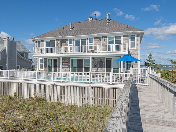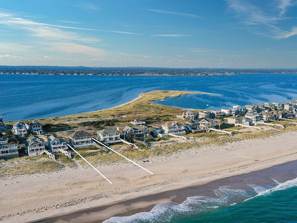 As you enter this pristine traditional home, enjoy breathtaking sunrise-to-sunset coastline views. The open floor plan includes a living room with fireplace, dining room, eat-in-kitchen with wrap around island, 2 guest bedrooms, 1 full bath and a powder room. A sweeping staircase leads to the second floor with a sitting room/den with spectacular ocean views and grand ceiling heights, 2 additional guest bedrooms, full bath and a primary bedroom suite with endless water views. With 75 ft. of beach frontage and spacious oceanfront deck and pool, deeded bay access, this bright and beachy home in this ultra-desirable location, has it all!