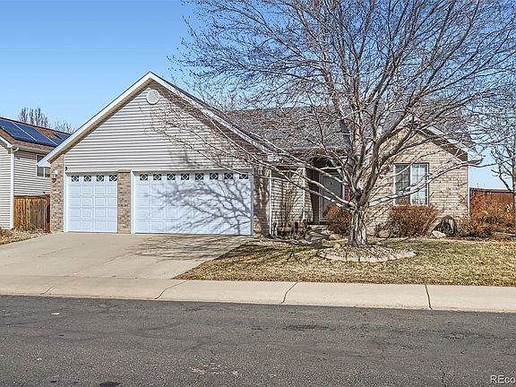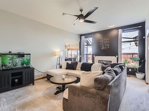 $5,000 Closing Cost Incentive with FPO. This south facing ranch style home is in great condition with fresh interior paint, refreshed cabinets, new garage doors and openers. Backing to open area with no neighbors behind and mountain views from the large primary bedroom and backyard! The primary has a slider that leads to the patio and a walk-in closet. Nicely landscaped. with a full privacy fence. New roof in 2023. Gas fireplace. Hardwood floors in large kitchen featuring a pantry, stainless-steel appliances, which all stay. Close to everything. Easy access to I-25 for commuters. Garage has 220V power. Full unfinished basement with pool table.