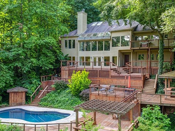 This is one of the coolest,most unexpected homes in Roswell!Contemporary style and high-end elegance,this home was made for entertaining.Fully renovated in 2011,interior features wide open floor plan,designer finishes,skylights everywhere,and exceptional river views.Exterior will take your breath away - more deck space than the home itself.It showcases 9+ levels of decks,gunite pool + cabana all overlooking the Big Creek River,feeds into Chattahoochee.This property is a little piece of paradise in the middle of exciting downtown Roswell.Be the envy of all your friends!