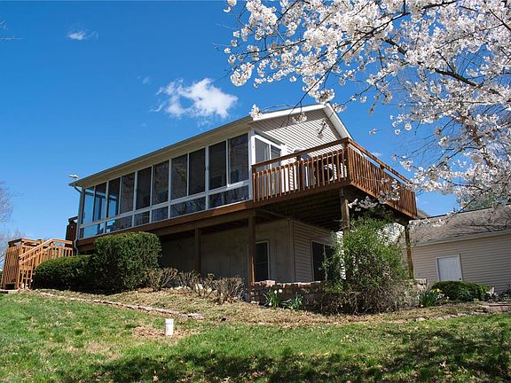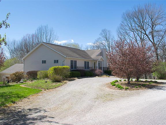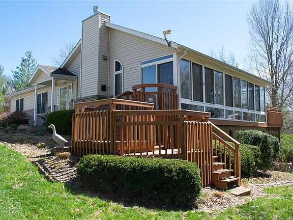 Beautiful setting with gorgeous landscaping greets you! Step into the open floorplan with hardwood floors throughout. The Great Room boasts Cathedral Ceilings & Gas Fireplace with marble surround. From the Dining area you can access the 30 ft long 3 season enclosed porch with ceiling fans and lighting, or enjoy the private setting from the 160 sq ft of Deck! There is also a Brick Patio off the walkout basement. The Master Bath offers a whirlpool Tub/Shower Combo and double linen closet. The huge Main floor Bath also serves as a laundry area and has the 2nd HVAC unit. The lower level has a Craft area with cabinets, built in bookcases, & counter with barstools. There's also a finished Studio/Office area with a hardwood floor and windows that could be converted to a bedroom. In the unfinished area there is a commode and slop sink, 2nd HVAC & water softener, workshop area & storage. There are double doors leading to the finished garage w/door leading to the patio. 3 outside faucets.