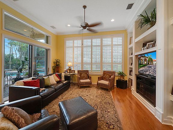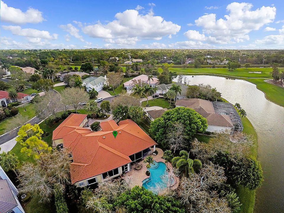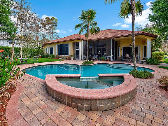 Lovely lake & golf course views in prestigious gated Binks Estates. Premium, lushly landscaped .53 acre lot on Cul de sac. 5 bedrooms 4 baths plus a Bonus room perfect for a playroom, teen room, in-law suite or office. Updated kitchen has newer stainless steel appliances, high-end custom granite counters & backsplash. Upgrades include gas & charcoal summer kitchen, steam sauna, heated pool with hot tub, outdoor shower w/ hot & cold water, coffered ceilings, crown molding, plantation shutters, spacious attic storage & hurricane accordion shutters. Upgraded ADT alarm system. Oversized 3 car garage, 3 A/C systems & new hot water heater. Wired for whole house generator. Biking distance to Outstanding Elementary & Middle Schools. 5th Bedroom currently used as an office.