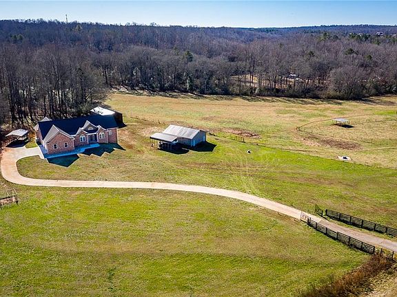 Stunning all brick 4 bedroom, 4 full bath home with large finished basement on a sprawling 16.89 acre farm with no land restrictions and a nice private gated entrance. From the moment you walk in the front door you are met with beauty. Home was custom built by current homeowner with high quality materials and care. Stunning foyer with hardwood floors that opens up to the dining room, the main living room and kitchen areas have vaulted ceilings and hardwood floors. There is a gorgeous stacked stone fireplace in the living room, the kitchen is open with plenty of counter space and granite countertops. The master is located on the main level and has a bathroom with double vanity, jetted tub and walk-in shower with a nice and large walk in closet with custom cabinets. Master also has its own walk out to the back deck with composite flooring. Laundry room is nice and spacious with utility sink. The basement features 9ft ceilings with 9 inch thick concrete walls and boasts a mini kitchen, large open space that would be great for entertaining, 3 additional rooms that would be perfect for a home theater, home gym and bedroom. There is also a safe room. Oversized 2 car garage with walk-out door. Large attic space perfect for storage. The home has beautiful pasture land with a large workshop, and approx. 950ft of frontage on Twelve Mile Creek adding even more charm to this home. 12 of the acres have been double fenced to protect your cows and horses, have a separate well, a cow barn and a little covered area for the livestock. This is a must see home! Security system will remain with home.