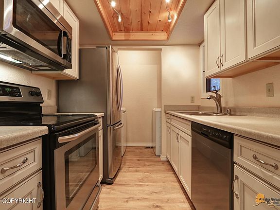 Totally updated condo with laminate floors throughout, Stainless steel appliances, fresh interior paint, wood burning fireplace with glass doors, and a covered balcony deck facing south with Chugach mountain views.Large storage area room in heated underground garage area. Master bedroom has walk thru closet and private bath. Private washer & dryer in unit.