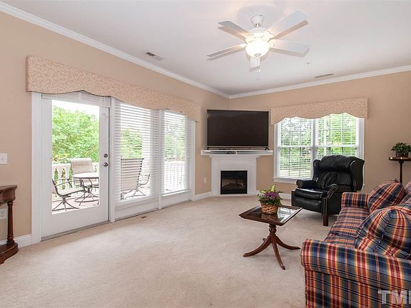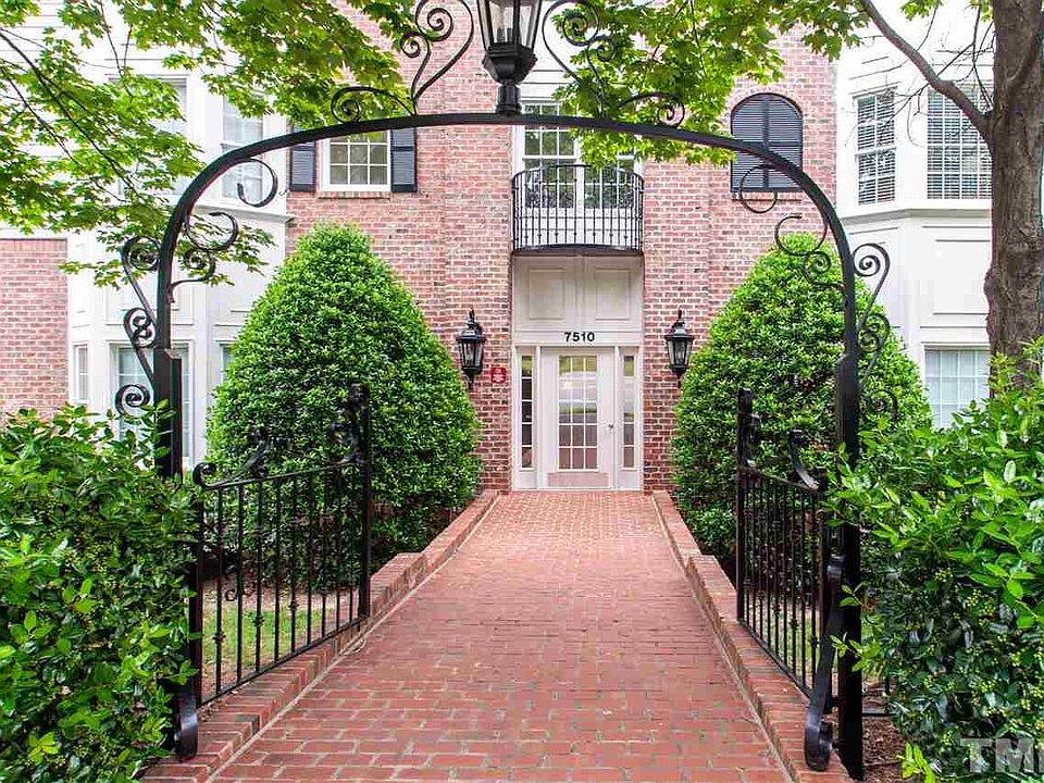 24-hour bldg security, elevator & parking garage. Lovely end unit condo w/hdwd & tile flrs. Built-in bookshelves in foyer area. Cook friendly kit offers granite countertops, under cabinet lighting & pass thru to dining. Lrg liv rm w/frpl, built-in TV niche & access to fabulous veranda w/brick floor, columns & att storage; spacious master bdrm has a bay window, WIC & private glamour bath. Spacious secondary bdrm. Lrg personal secure storage in garage. Terrific N Raleigh loc - conv to shopping, dining & 540