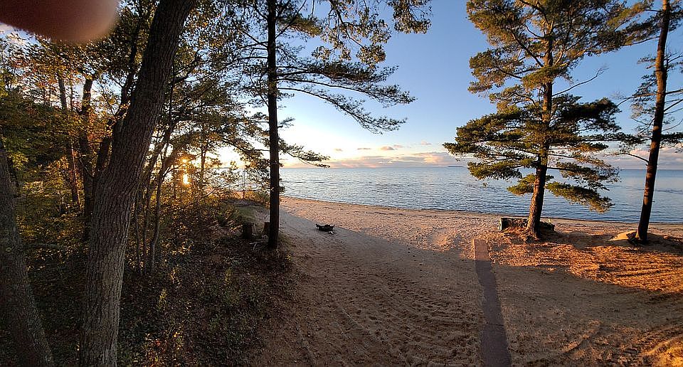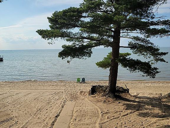 1.35 Acres. Home has wrap around deck and is on Lake Huron. 150 feet private beach with wooded area and ample parking, well off of M25.