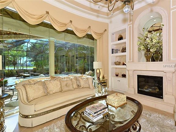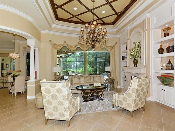 "No detail has been spared when we updated our home." A brilliant custom home designed by Pruett. Exquisite finishes and spectacular details. Double glass leaded entry doors with marble and tile. Soaring ceilings. Four bedrooms with en suites. 20 inch tile, crown, tray ceilings and custom closets throughout this masterpiece. Solid wood doors. Surround sound. Charming living area with a huge dramatic aquarium window overlooks the pool and spa. Stone gas fireplace, niches and wall built-ins. Stunning rounded wet bar that seats four comfortably with wine cooler, sink and cabinets. Chef's kitchen and wet bar with new granite. Prep island, rich Maple cabinets, striking stone backsplash, six-burner stove and warming drawer, water softener and purifier. Lengthy eat-at bar. Huge separate breakfast area. Walk-in pantry. Den offers cherry floors. Spacious family room with wall built-in. Owner retreat has hand scraped wood floors, french door, two walk-ins. Owner's bath with marble counters, dual sinks, walk-in shower, jetted Jacuzzi and cozy vanity. Massive theatre room complete with seating and audio. Wood stairway. Gigantic upstairs bonus room complete with wet bar and screened lanai. Bath off kitchen has spill over granite edge. Cedar lanai ceilings, herringbone paver. Outdoor kitchen with travertine ledge stone and granite. Pool has self pop-up cleaning system. Child safety fence. 3 a/c zones. Three thermostats, humidistat. Wireless camera inside home. Private with lake view. Chandelier in LR doesn't convey.