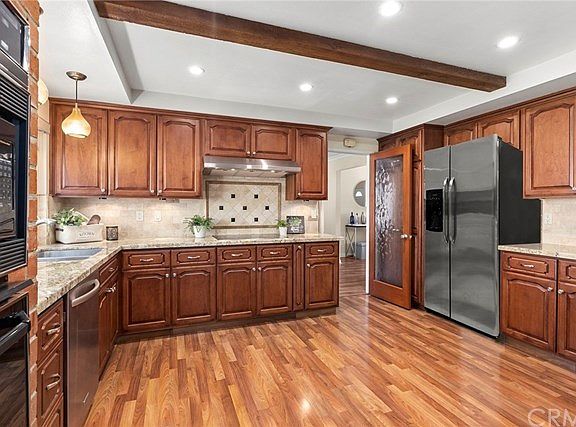 This exquisite La Palma home is sure to please. Great cul-de-sac location and amazing neighborhood. Inviting covered front porch complete with gorgeous pavers and beautiful double door entry. 4 spacious upstairs bedrooms and 3 bathrooms. The separate living, dining and family areas coupled with the wood beam architecture & classic wet bar create a delightfully versatile floor plan. Large open kitchen concept includes pantry, tons of cabinet space, granite counters, stainless steel dishwasher and range hood, microwave, custom tile backsplash and reverse osmosis system. Huge master bedroom suite with dressing area, dual closet areas and remodeled bathroom with custom tile work. Remodeled downstairs bathroom complete with shower and pedestal sink. Upgraded upstairs guest bathroom includes dual sink vanity. Dual pane windows, Central A/C & Heat, fireplace, laminate flooring, new light fixtures, premium 2-panel doors, recessed lighting and water softener. The tranquil backyard includes a covered patio with lighted ceiling fan, stainless steel potting bench, storage cabinet, block wall fencing and fruit trees - lemon, lime and kumquat. A perfect setting for the avid gardener, entertaining or just relaxing. Automatic sprinkler system. 2 car attached garage with direct access, laundry area, roll-up door, automatic opener, workbench, shelving, 2 door cabinet and overhead storage. Central to everything Orange County has to offer - Disneyland, Knott's Berry Farm, Angel Stadium, The Honda Center, Cerritos Mall, indoor and outdoor shopping venues, restaurants and Cerritos Performing Arts Theater.