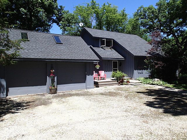 3 Lots=2+ acres! Wooded paradise retreat where you can vacation year round! A welcoming porch invites you into this unique home. Full foyer, vaulted ceilings, skylights, wood floors, fireplace with mantel, and tons of windows. 1st floor master suite amazes with vaulted ceilings, full master bath and private balcony to enjoy coffee and gaze out at nature. There is walk in closet too! Cozy family room leads to large, wrap around deck w/wooded views. Off the living room is a glass enclosed sunroom or greenhouse. Full finished walk out basement. Heated over-sized garage has a small attached work room and plenty of room. Even the laundry room offers skylights! Big enough to double as a a mud room. Outside there is a storage shed. Walk the grounds on paths and traverse the wooden bridge. Great Value! We can offer a quick close too!