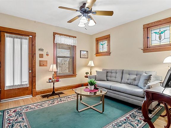 This lovely brick home features 3 bedrooms, 2 full baths, and over 1,500 sq feet of living space! The inviting covered front porch leads into this charming home where you'll find beautiful hardwood floors, stained glass windows, a spacious living room and a separate dining room. The main floor is conveniently equipped with a bedroom and a full bathroom. Directly off the large, eat-in kitchen is a spacious screened porch overlooking the patio and fenced backyard. Upstairs has 2 bedrooms with plenty of closet space. The 2nd floor full bath has a tub/shower, tile flooring, and a large linen closet. The unfinished basement has plenty of storage space, workshop area, sump pump, and a walk out to the rear patio. Shed in backyard stays with the property. Oversized concrete driveway has plenty of space for multiple vehicles. Fantastic home just minutes from Maplewood's restaurants, coffee shops, and aquatic center!