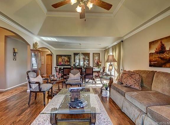 Beautiful home on corner lot! Upgrades galore, granite counters, beautiful hardwoods + tile, new storm shelter & more! Kitchen opens to living area. Great theater room upstairs w/office + bath. Could convert to 4th bedroom.