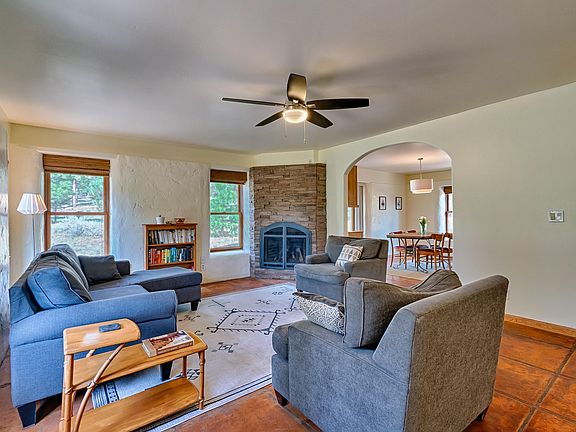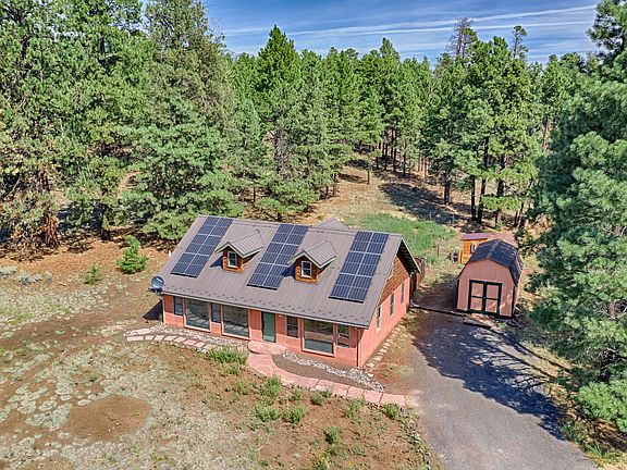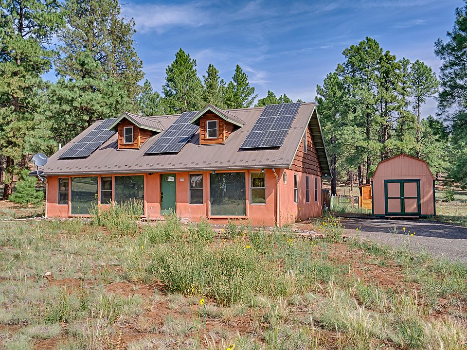 Tucked away on five acres of tall ponderosa pines, this sustainable, eco-friendly property is a rare find in Flagstaff. Custom built by a local master strawbale home builder, the home has thick walls that are naturally insulated as well as Trombe walls. It stays temperate year-round with minimal heating and cooling needed. A state-of-the-art solar array powers the place with renewable electricity (and a negative monthly electric bill). Local and handcrafted touches abound, from sandstone counters quarried from Ash Fork to hand-plastered walls to locally sourced ponderosa pine siding and hardwood floors. Other recent upgrades include fresh paint, new carpet on the steps, modern lights and ceiling fans, and hardscaping from Flagstaff Native Plant & Seed.
