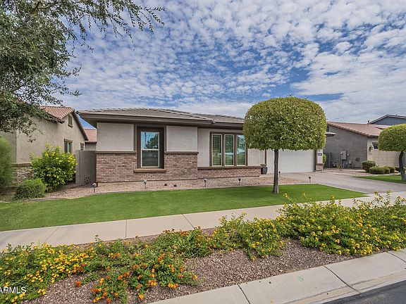 You will NOT want to miss this chance to own this beautifully appointed home (with diving pool!) in Desert Place at Morrison Ranch. Built with quality by Ashton Woods Homes, the owners have added their own farmhouse and modern touches to the interiors of this awesome 4 bedroom/4 bathroom/3 car garage floorplan. Enter into your own private courtyard and walk into the beautiful foyer. To your left are the bedrooms. To your right is a gorgeous office with a hand crafted barn door. Straight ahead leads to the open living area/dining/kitchen and double door entrance to the owner suite. The great room and dining room have abundant windows and natural light which also lead to views of the diving pool and its water features. The great room has a fireplace, custom shelves, and plenty of space. The kitchen is a chef's dream with a 36 inch drop in gas stainless steel range, a wall oven/microwave combination, granite countertops, LED lighting, plenty of cabinets for storage, and an island that can accommodate seating as well as prep space and buffet area for the holidays. There also is a pantry and nearby drop zone near the garage and laundry room. Owner suite has plenty of space to accommodate a king size bed and sitting area, and there is a private door exit to the back yard and covered patio. Owner ensuite has separate vanities with a beautiful soaking tub between them. Walk in owner suite closet is spacious. Other bedrooms share a Jack and Jill style bathroom suite. The garage has 3 stalls for automobiles and a storage cabinet/shop setup. In the backyard the diving pool has water features and plenty of room to splash and play. Don't miss the sitting ledge or shallow shelf for small ones or simply sitting and soaking up the sun. Pool fence is able to come down with easy storage. This home is meticulous and move in ready!