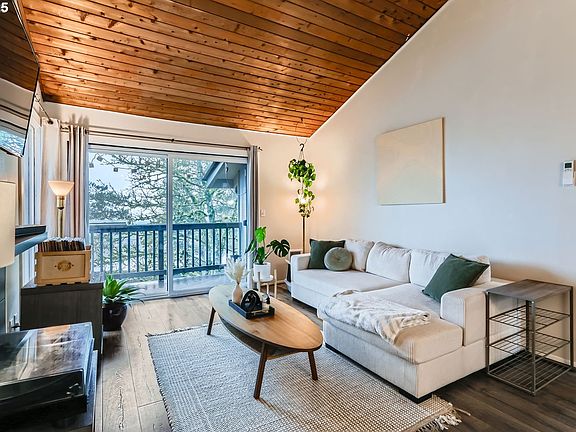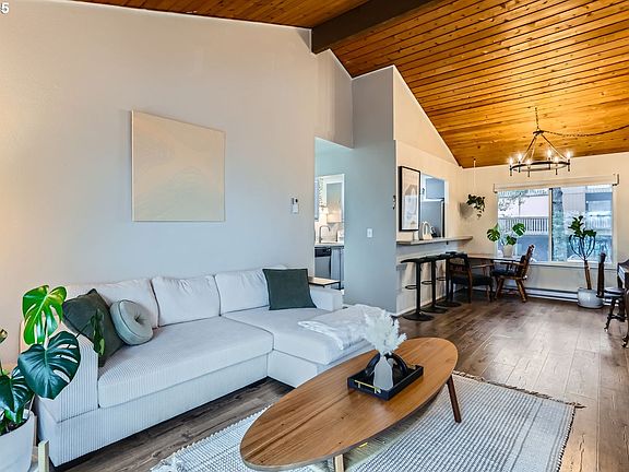 Stunning NW Contemporary condo in desirable Sylvan Heights community! With vaulted tongue-and-groove ceilings, new vinyl windows, and a sought-after great-room plan, natural light abounds! This condo has been meticulously maintained and recently improved with a new mini-split heating and cooling system, laminate flooring, recent interior paint, updated fixtures, and more! Upgraded kitchen offers newer cabinets with soft-close drawers, laminate flooring, and all appliances included. The kitchen opens to the vaulted dining room and adjacent living room, featuring a fireplace with tile surround and slider to a private deck with a serene treed view. Two spacious bedrooms offer vaulted tongue-and-groove ceilings and ample closet space. Rare in-unit laundry with washer/dryer included! Sylvan Heights is centrally located with spectacular sunset views and easy access to Hwy 26 and 217, St. Vincent's Hospital, and NW Portland. HOA includes exterior maintenance, landscaping, and numerous community amenities such as a gym, pool, hot tub, clubhouse, and tennis courts, plus garbage service and water/sewer services.