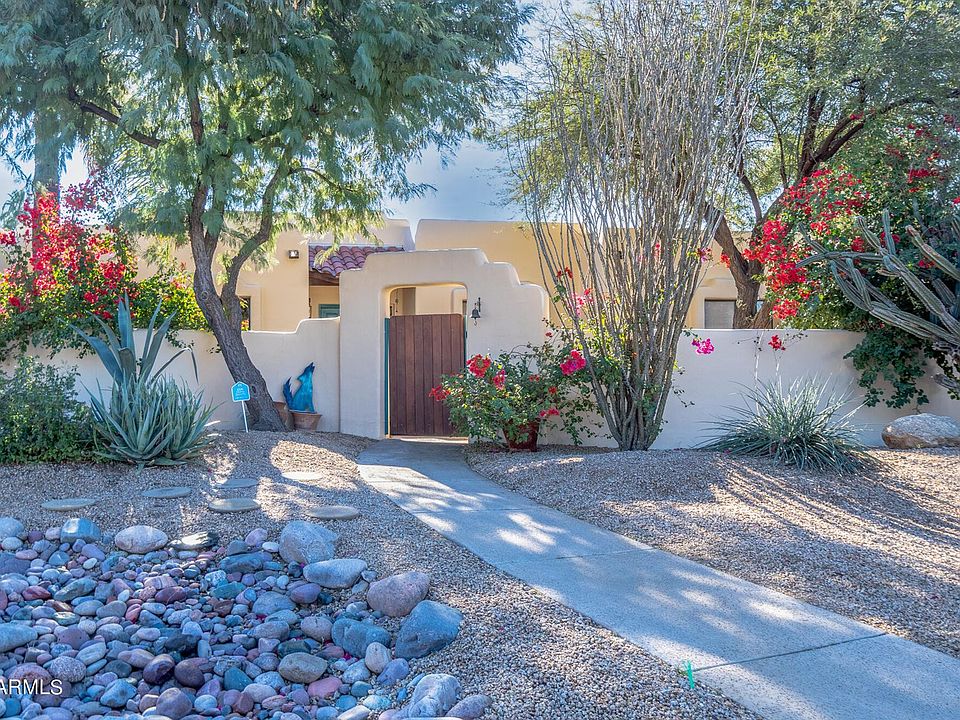 Custom Santa Fe Style Home in Very Desirable Scottsdale Neighborhood w/no HOA-Gated Courtyard.4 Bed & 3 Baths Plus Pool. Famous screen writer lived here and you can sense the Calm Serene Environment. Courtyard Entrance shuts out the world as you enter into a great space for living the Southwest Lifestyle. Large Living Spaces w/Beautiful Views from all rooms. Beamed High Ceilings & Smooth Textured walls. Master bedroom is a complete retreat w/sitting area and separate door to the backyard.Spacious Kitchen and Family Room Plus Formal Living & Dining rooms. Writer's Den is ideal place to be Creative. Laundry Room large enough to hold all your craft and wrapping supplies.Tongue and Groove Patio provides loads of charm.Fully Fenced Poolw/Updated Equip.Grassy Play area.Beautifully Designed Home.