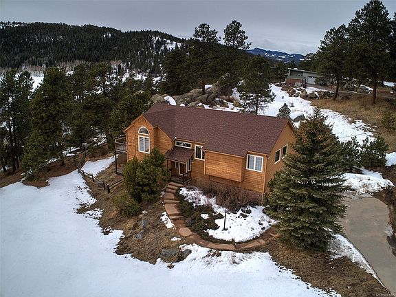 A wonderful place to experience the beauty and wonder of Evergreen living. Relax and enjoy the mountain views from the open floor plan and expansive windows allowing lots of natural light. The living room and kitchen have beautiful wood vaulted ceilings, and a spacious floor plan for entertaining. This is a perfect home for main floor living with the master bedroom, two bedrooms, two bathrooms and the laundry room on the main floor. There is a large family room downstairs with a murphy bed and sliding glass door leading to the side yard. The family room also has a bathroom and storage area. This is a highly desirable neighborhood! It's a 13 minute drive to downtown Evergreen and 45 minutes to Denver. With a little bit of work, this must-see home is a gem.