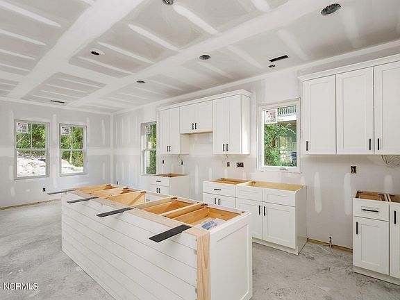 An Emerald Isle new construction stunner located second row from the water, with sound access located directly across the street! Enjoy island life from this 5 bedroom, 4.5 bathroom home at 7513 Sound Drive, featuring a first-floor primary suite, screened porch and option to install a pool to make it a true coastal oasis. On the ground floor, you'll find an open-concept kitchen with quartz countertops, shaker cabinets and walk-in pantry, light-filled dining nook, and living room with a fireplace and three-panel sliding door access to the spacious screened porch. In addition to a powder room, the first floor also features the primary suite with a stunning bathroom complete with dual vanities, tiled shower and walk-in closet.