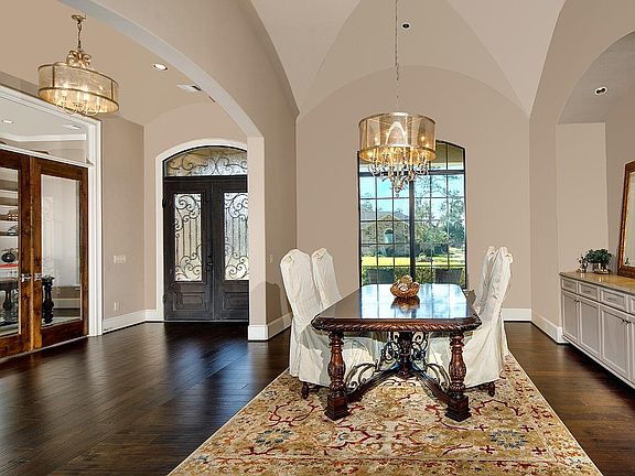 Stunning 1.5 story custom home overlooking a serene pond in gated Lago Woods! Beautiful paved driveway leads to the covered front porch surrounded by impeccable landscaping, providing amazing curb appeal! Sleek island kitchen with tumbled marble backsplash, soft close glass front cabinetry with undermount lighting, Viking appliances and spacious pantry opens to the living area with floor to ceiling gas log fireplace; private study with French doors, crown moulding and built-ins; formal dining has recessed ceiling, built-in bar with wine fridge and glass display cabinet; owner's retreat has wood beam ceiling and dual walk-in closets; all 4 bedrooms have en-suite baths and custom tile; media room down; game room up; 3 car attached garage with epoxy floor; outdoor living features a covered patio with wood beams, summer kitchen, fireplace, custom heated pool and large spa with tanning ledge.